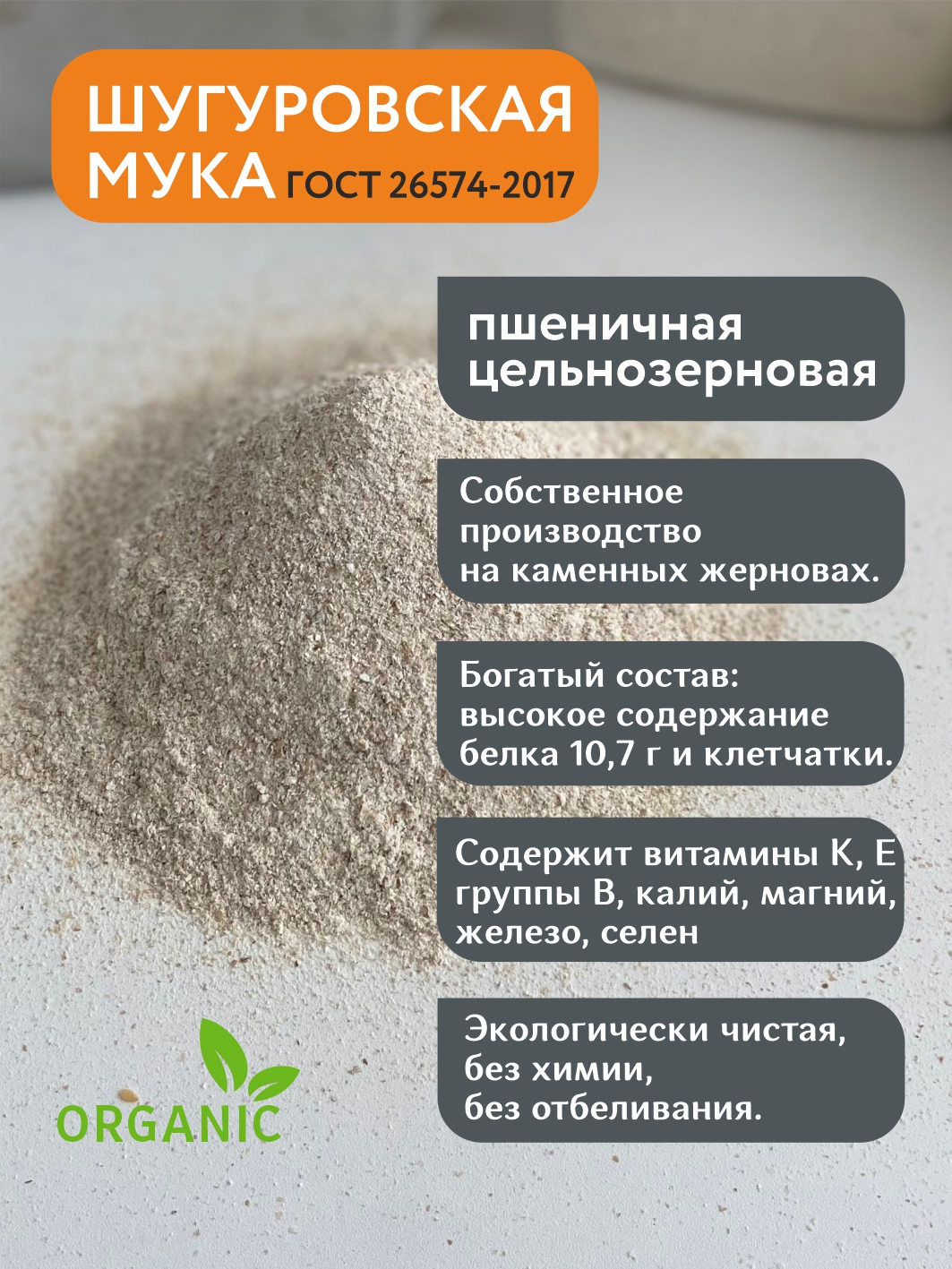 Мука пшеничная цельнозерновая из Шугуровского зерна, выращенного без использования химических удобрений и ядохимикатов в хозяйстве Анатолия Ивановича Шугурова ТНВ «Пугачевское» в Пензенской области. Органический сертификат на зерно № РСК О.11АБ45.00162
